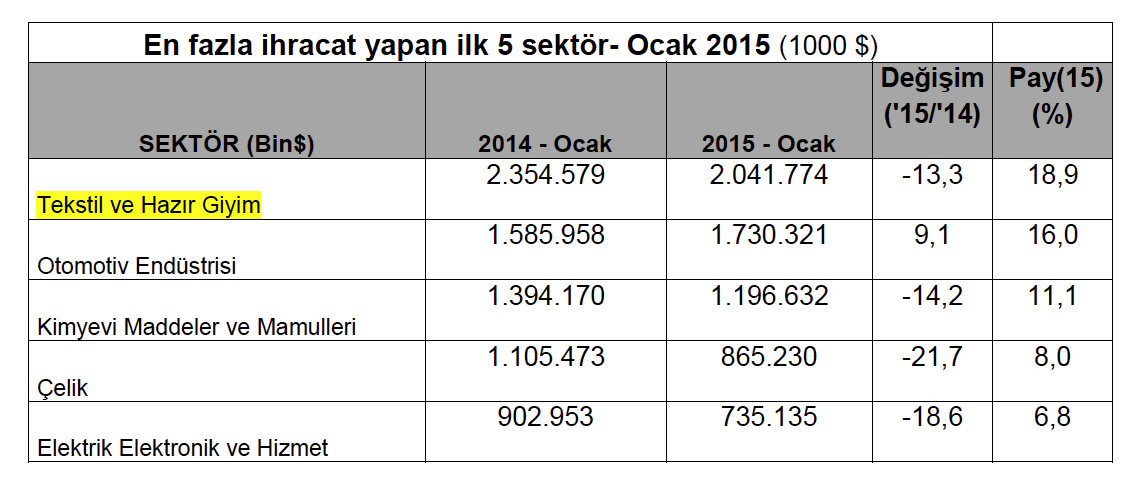 Türkiye İhracatçılar Meclisi tarafından açıklanan rapora göre, 2015 yılı Ocak ayında ihracat miktarı geçen yılın aynı ayına göre % 9,8 düşüşle 10 milyar 803 milyon 970 bin dolar olarak açıklandı. TİM’in ( Türkiye İhracatçılar Meclisi)  açıklamasına göre, son 12 aylık ihracat ise yüzde 2,5 artışla 156 milyar 118 milyon 816 bin dolar olarak belirtildi.